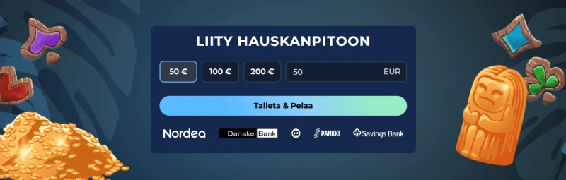 Moana Casino käyttää välittömiä verkkopankkisiirtoja – sekä talletuksiin että nostoihin. Teemme yhteistyötä useiden suomalaisten pankkien kanssa, kuten OP / Pohjola, Nordea, Danske Bank, Säästöpankki, POP Pankki, S-Pankki, Aktia, OmaSP ja Ålandsbanken. Valitset vain Talletus-välilehden, valitset verkkopankkisiirron, valitset pankkisi logon ja vahvistat maksun normaalisti verkkopankissasi.