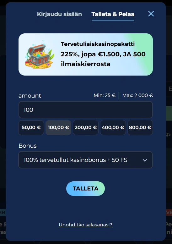 Klikkaa etusivulla ”Talleta & pelaa” tai avaa kassa ja valitse Talletus-välilehti.